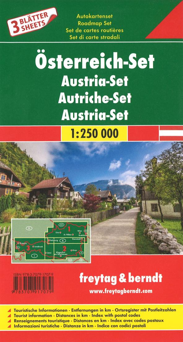 Austria at 1:250,000 on three large detailed road maps from Freytag & Berndt sold as a set, with good presentation of the country's topography, towns and villages worth visiting highlighted, and an index with post codes.