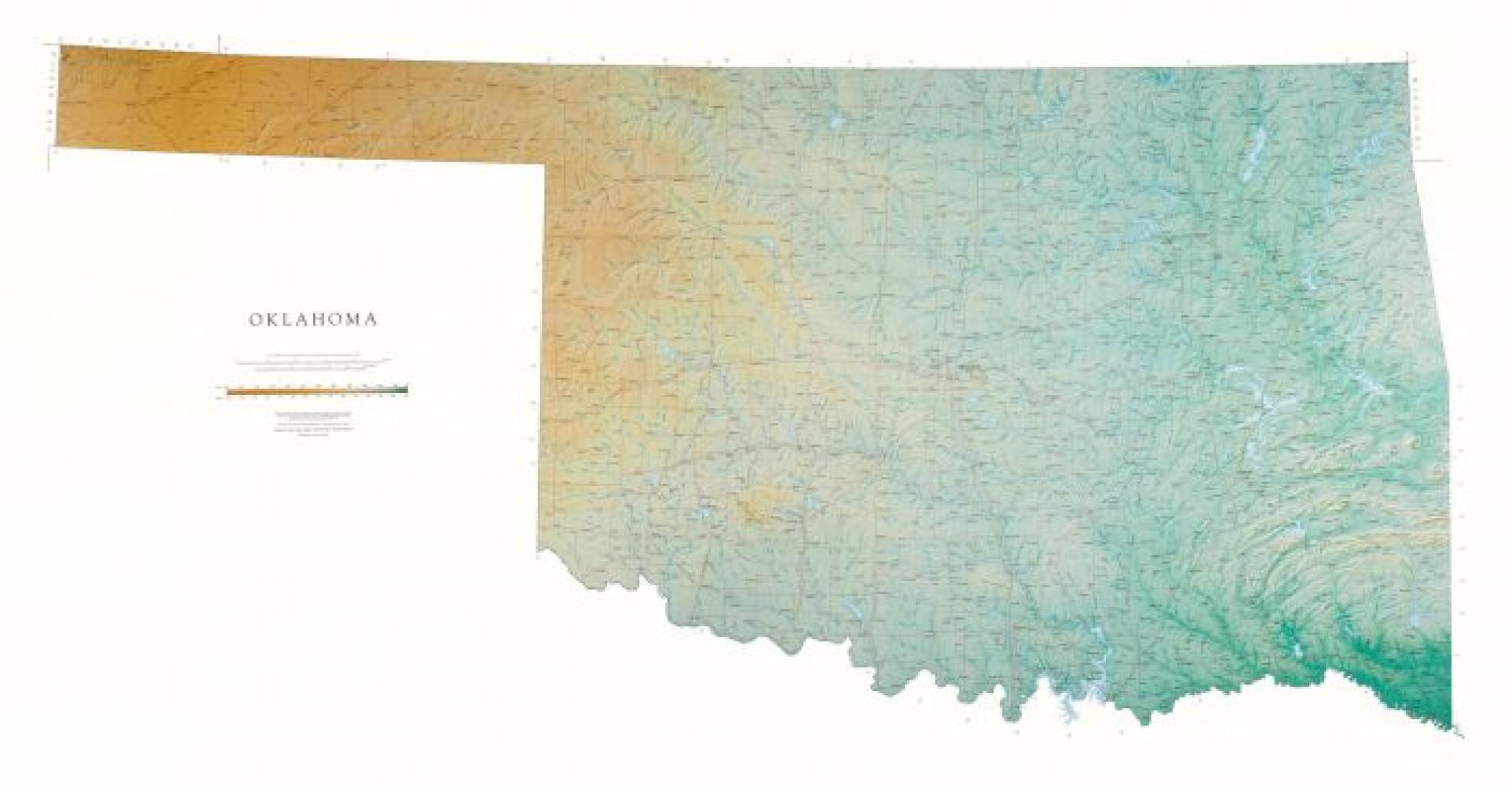 Detailed physical wall map of Oklahoma State at a scale of 1:500,000. Laminated.