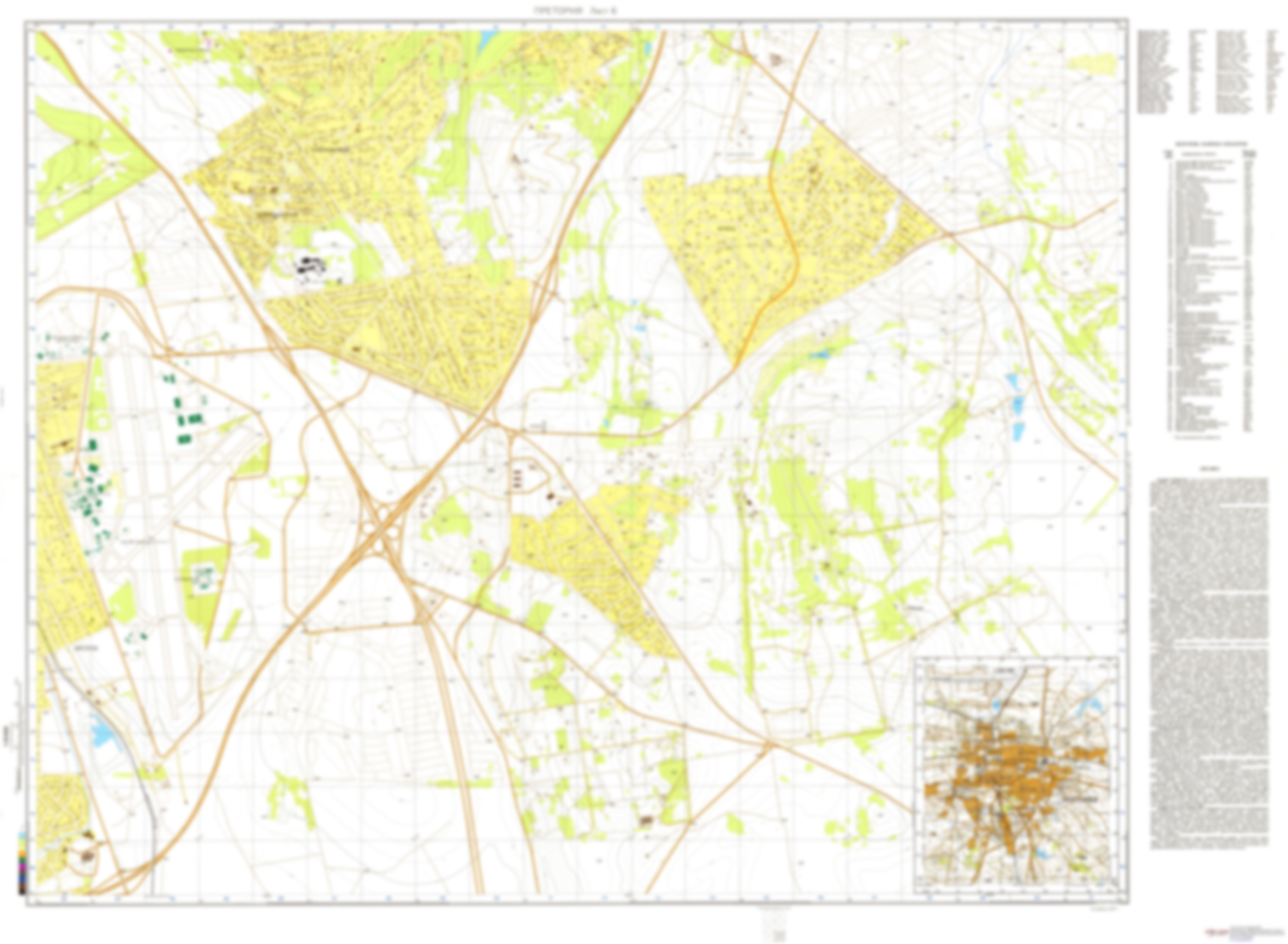 The Soviet Military City Plan(s) of Pretoria 6 (South Africa) is one in a series of highly detailed topographic city maps developed by the USSR Ministry of Defense during the Cold War era. These collectable, high resolution print-on-demand editions are delivered on premium, acid-free, matte paper. This item is sheet number 6 in a set of 6 sheet(s) for Pretoria